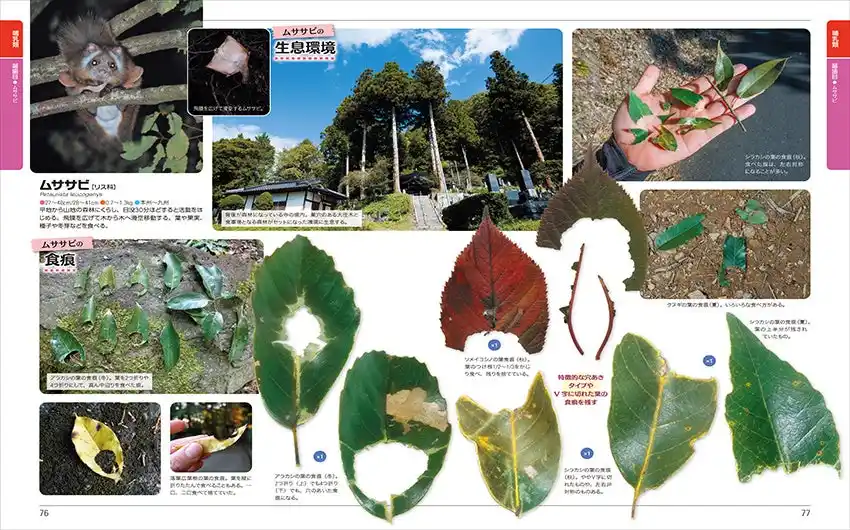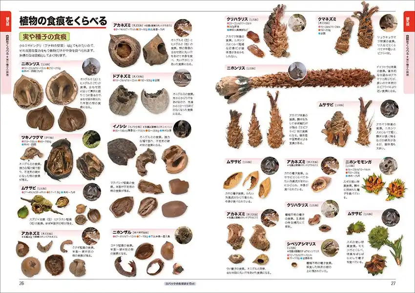 本書は身近で見られる哺乳類や鳥類の足跡や食痕、フンなどについて、似ているものを見開きに並べて比較し、紹介した図鑑です。白い背景で撮影された写真の多くは実物大で掲載しているので、実物と見比べての比較もしやすくなっています。 |