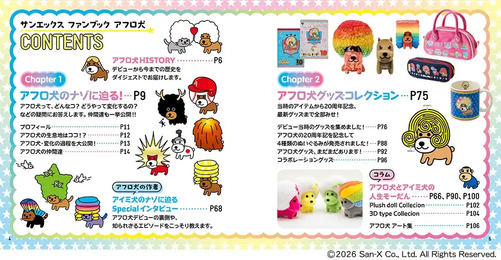 アフロ犬History/アフロ犬のさまざまなビジュアル/アフロ犬とアイミ犬の人生そーだん/アフロ犬グッズコレクションなど盛りだくさんの内容です。 |