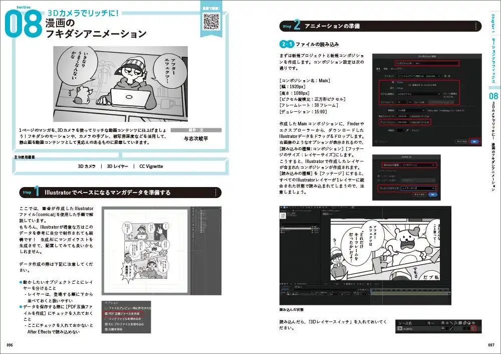 全作例のAfter Effectsプロジェクトファイルがダウンロードできるので、実際に触って学習していただけるようになっています。全作例のプレビュー動画も閲覧できます。 |