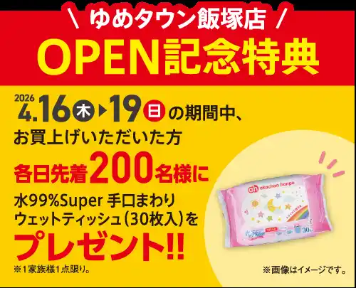 株式会社赤ちゃん本舗(本社:大阪市中央区 https://www.akachan.jp )は、福岡県飯塚市の商業施設 「ゆめタウン飯塚」内に、『アカチャンホンポ ゆめタウン飯塚店』を2026年4月16日(木)にオープンいたします。また、オープンを記念いたしまして期間限定セールやポイントアップ企画などを実施いたします。 |