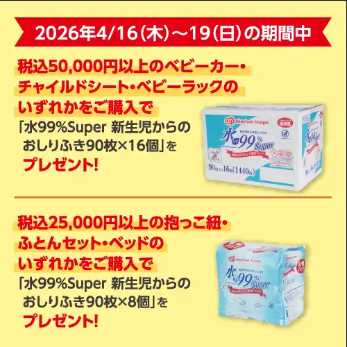 さらに期間中、税込50,000円以上のベビーカー・チャイルドシート・ベビーラックのいずれかをご購入の方へ「水99%Super 新生児からのおしりふき 90枚×16個」を、税込25,000円以上の抱っこ紐・ふとんセット・ベッドのいずれかをご購入の方へ「水99%Super 新生児からのおしりふき 90枚×8個」をプレゼントいたします。 |