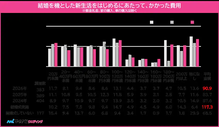 ◆結婚を機に新生活にかけた費用は平均90.9万円。結婚式を実施した人は平均117.3万円、実施していない人は平均68.5万円