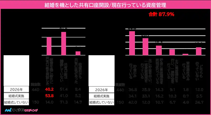 結婚を機に「共有口座」を開設した人は40.2%となった。中でも結婚式を実施した人では53.8%に達し、実施していない人(14.0%)39.8ptと大きな差がみられる。また、資産管理については87.9%が貯金または資産運用を行っており、貯金を中心に一部資産運用を取り入れるといった、堅実な資産形成スタイルが多く確認された。こうした結果から、結婚後の生活において「お金の共同管理」や将来を見据えた資産形成に取り組んでいる人が多いことがうかがえる。【図5】 |