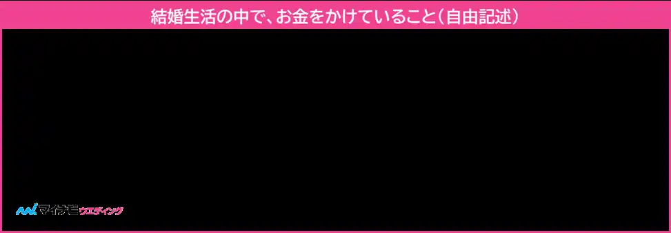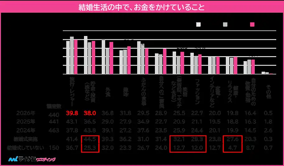 結婚生活の中でお金をかけていることを聞いたところ、「旅行・レジャー」が39.8%、次いで「貯金・投資」が38.0%という結果となった。また、「自分へのご褒美」「美容」「趣味」など、自己充実に関する支出は前年より増加した。