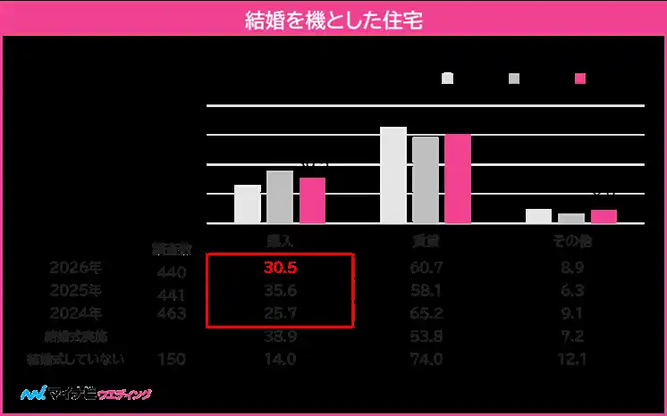 ◆マイホームの購入率は30.5%で、住宅価格高騰が夫婦の取得行動に影響 |