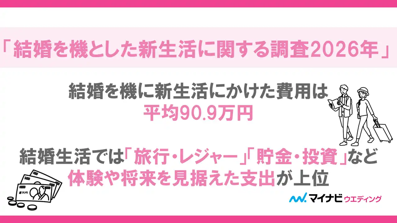 結婚を機に新生活にかけた費用は平均90.9万円。結婚生活では「旅行・レジャー」「貯金・投資」など体験や将来を見据えた支出が上位