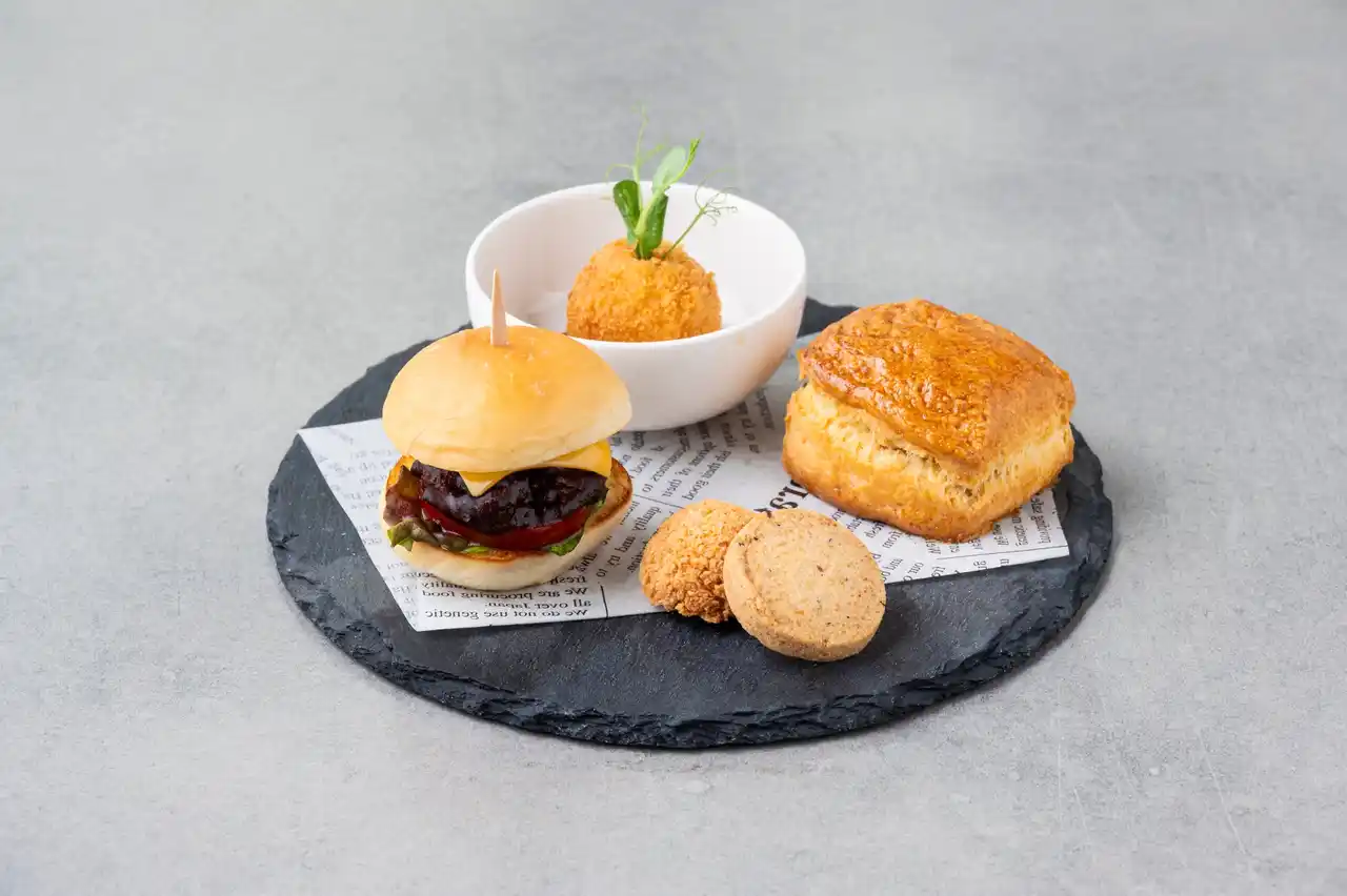 | 中段:スコーン・胡椒とチーズのクッキー・ココナッツマカロン・ミニバーガー・ライスコロッケ | |||||||||||||||