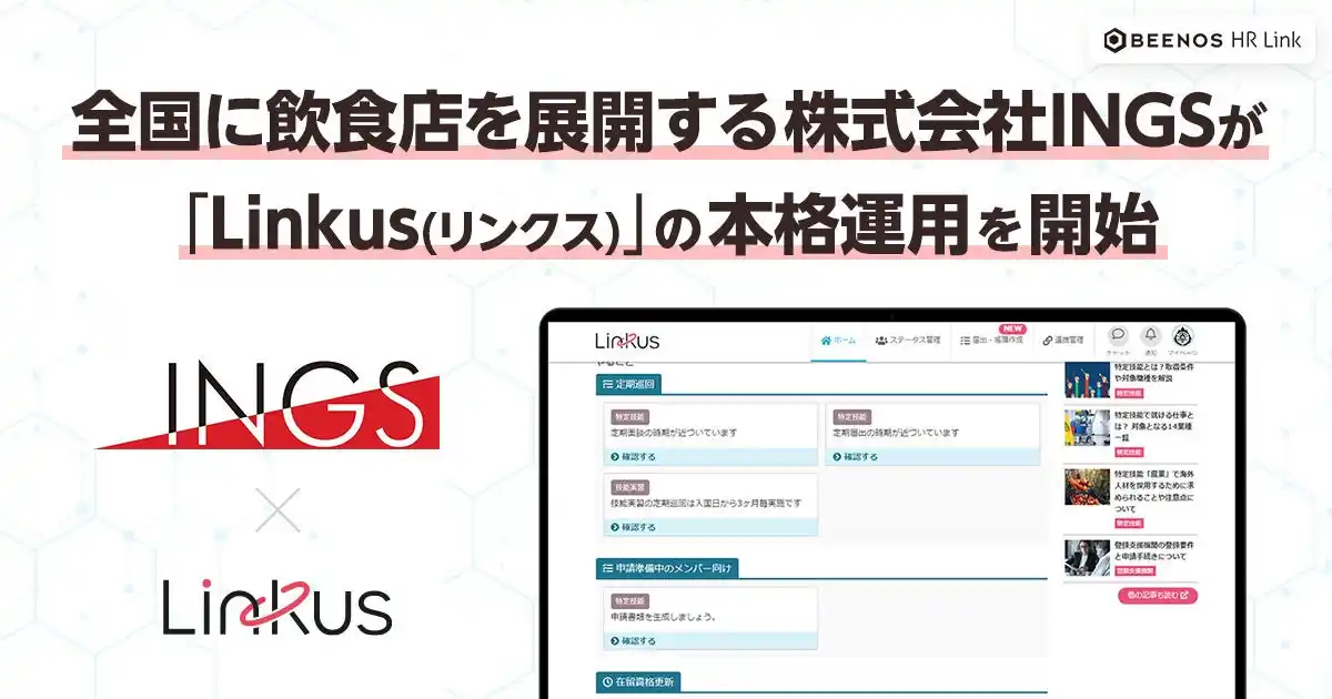 | BEENOS株式会社の連結子会社であるBEENOS HR Link株式会社(以下「BEENOS HR Link」)は、全国に飲食店事業を展開する株式会社INGS(本社:東京都新宿区、代表取締役社長:青柳誠希、以下INGS)に特定技能の支援管理業務システム「Linkus(リンクス)」が導入されたことをお知らせいたします。 | ||||||