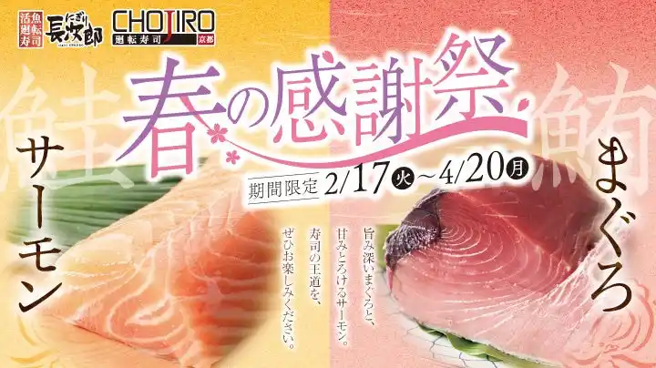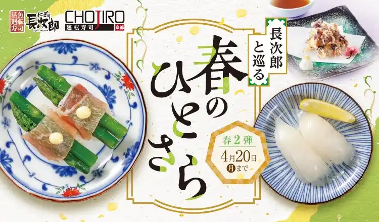| 株式会社フーズネット(本社・大阪府大阪市、代表取締役執行役員社長・加藤誠)が運営する「活⿂廻転寿司にぎり長次郎」 「廻転寿司CHOJIRO京都」は、2026年3月24日(火)から2026年4月20(月)まで、春メニュー第2弾を期間限定で販売いたします。春メニュー第2弾では、「春のひとさら」と題して「のどぐろ」や「ほたるいか」など、期間限定のネタをお召し上がりいただけます。この季節ならではの味わいを、にぎり長次郎で心ゆくまでお楽しみください。 | |||||||||
