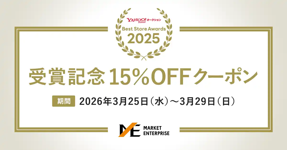 株式会社マーケットエンタープライズ(東京都中央区、代表取締役社長:小林 泰士、東証スタンダード・証券コード3135、以下「マーケットエンタープライズ」)は、「Yahoo!オークションBest Store Awards 2025」(主催:LINEヤフー株式会社)において、約21,000ストアの中から総合賞第1位に選出されました。昨年度に続く2年連続の快挙達成を記念し、2026年3月25日(水)から3月29日(日)までの5日間、当社ストア内の商品が15%OFFになる「受賞ストア限定クーポン」が配布されます。