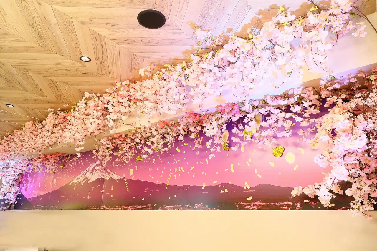 今の季節は、満開の桜をモチーフにした装飾によって、華やかさとゆったり過ごせる落ち着きを両立した空間で、春の訪れを視覚的に体感できる演出をしています。今回、春メニューの開始に合わせて、食事と空間の両面から心がやわらぐ時間を提供することを目的として、「屋内お花見」を企画しました。天候や混雑に左右されず店内で春らしい雰囲気を楽しめることから、友人同士の食事、歓送迎会、新生活の節目の集まりなど、幅広いシーンで活用いただけます。 |