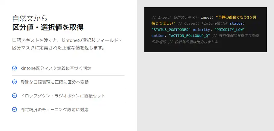 口語テキストを渡すと、kintoneの選択肢フィールド・区分マスタに定義された正確な値を返す。曖昧な表現も正確に変換。 |
