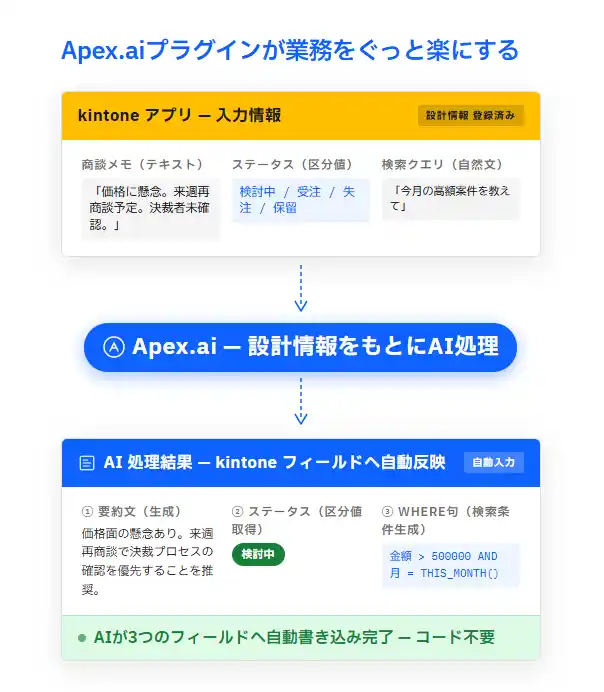 株式会社エーエスピーコム(所在地:京都府京都市 代表取締役社長:奥原啓史)は、企業が独自に構築したkintoneアプリの設計情報(フィールド定義・区分値・処理ロジックなど)を、AIに登録・学習させることで、汎用AIでは不可能だった「業務ルールに忠実なAI処理」を、プログラミング不要で実現するkintoneプラグイン「Apex.ai」(以下:本サービス)を2026年3月23日(月)より提供開始いたします。 |