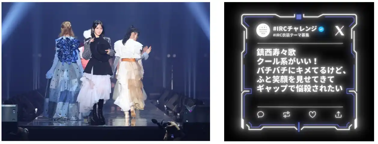 1”を実施しました。2月に、“あなたが見たい、推しのコーデを大募集”するX投票連動企画「IRC衣装テーマ募集」を実施。全国から寄せられたファンの想いを最新のテクノロジーで読み取り、投稿コメント一つひとつをもとにデザイナーやスタイリストが制作した衣装をまとったアイドルたちがランウェイを彩りました。ファンとともに創り上げたIRC初の“ファン参加型ショー”として、会場を大いに盛り上げました。当日MCのハリー杉山も「ファンとアイドルが一緒にステージを創り上げるイベント」と称したように、応援がスコアとして評価され特典として還元される“新しい推し活”の体験がリアルとデジタルの両面で実証されました。 |