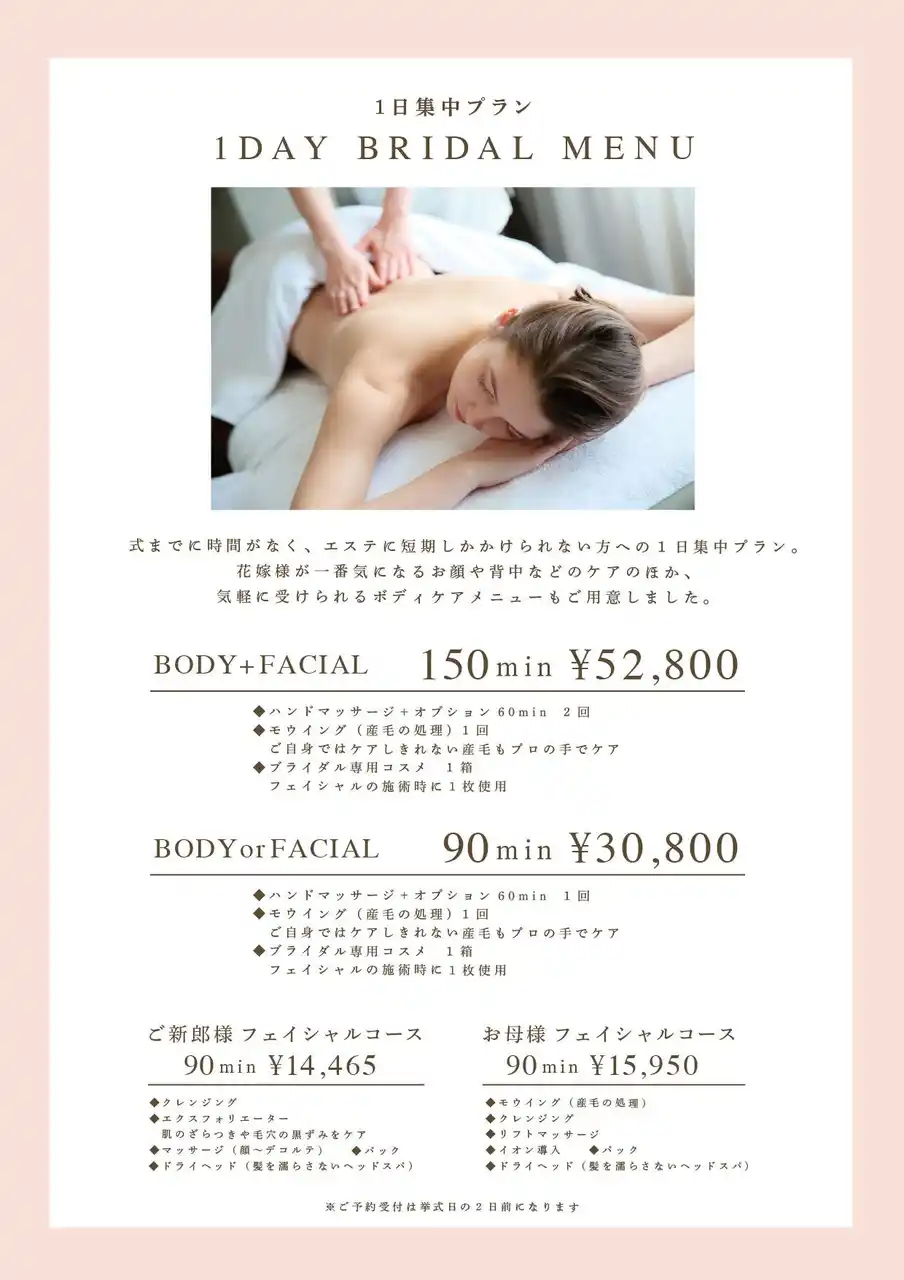 花嫁様 1日集中プラン ボディ+フェイシャル 150分 52,800円(税込) |