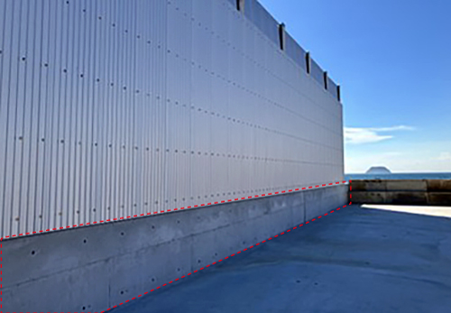 このたび、実施工規模でのBiSCoの製造法を確立し、海上桟橋の防潮壁に試験適用しました(写真1)。