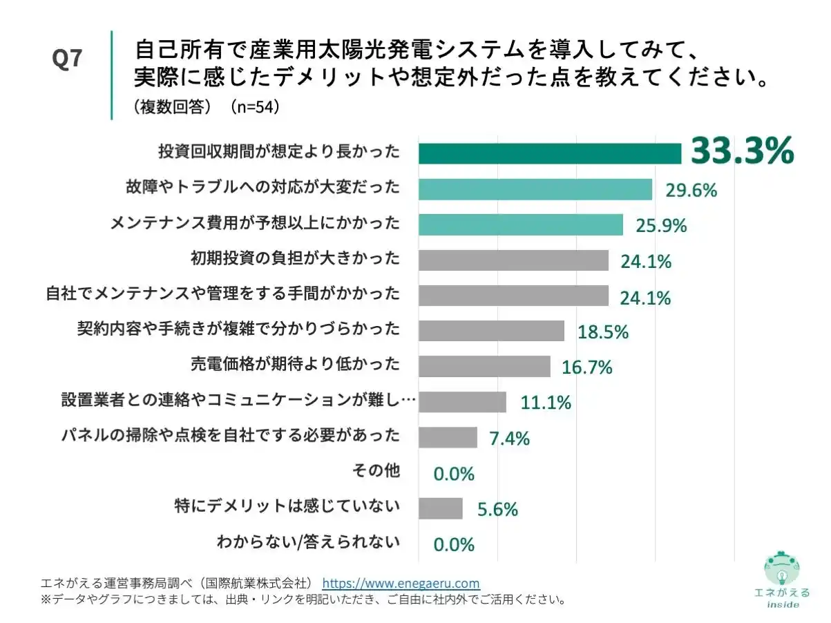 「Q7. Q1で「自己所有(自社で設備を購入・所有している)」と回答した方にお聞きします。自己所有で産業用太陽光発電システムを導入してみて、実際に感じたデメリットや想定外だった点を教えてください。(複数回答)」(n=54)と質問したところ、「投資回収期間が想定より長かった」が33.3%、「故障やトラブルへの対応が大変だった」が29.6%という回答になりました。 |
