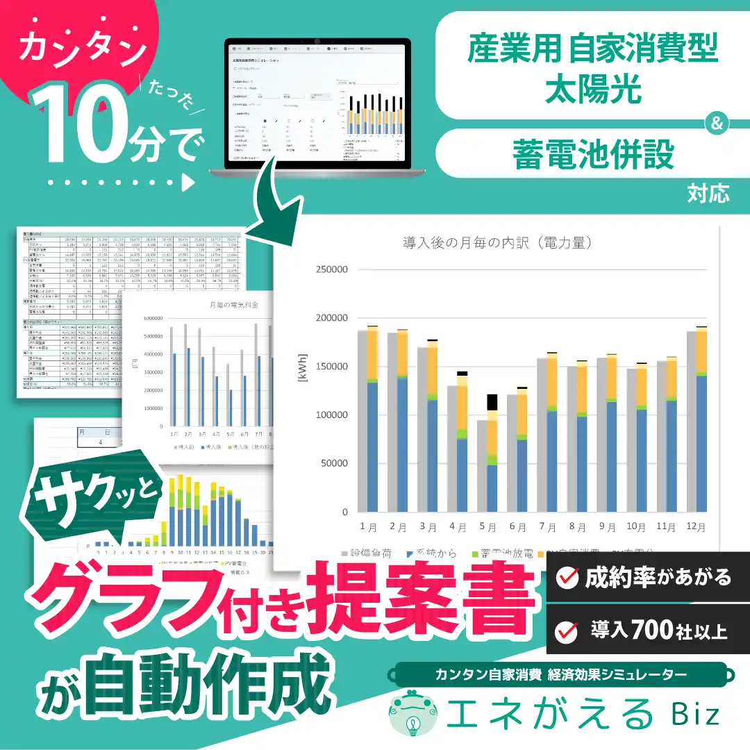エネがえるBizは、産業用自家消費型太陽光発電システム導入の提案を迅速かつ正確に最適化するサービスです。デマンドデータを入力するだけで、投資対効果や回収期間の詳細なレポートを短期間で提供し、初期段階でも具体的な数値を迅速に提示できます。 |