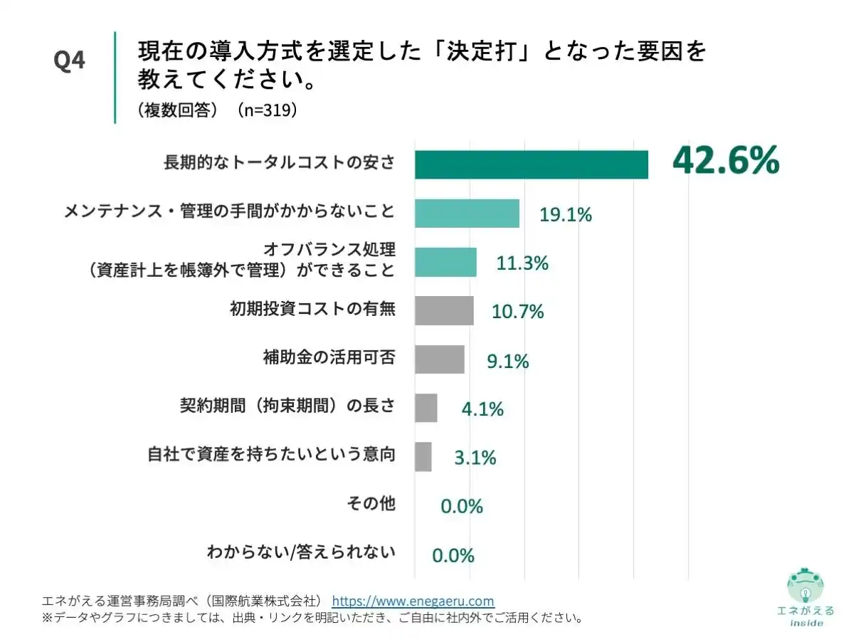 「Q4. Q1で「オンサイトPPA(自社敷地内に設置し、発電した電力を購入する)」「オフサイトPPA(自社敷地外の発電所から電力を購入する)」「自己所有(自社で設備を購入・所有している)」と回答した方にお聞きします。現在の導入方式を選定した「決定打」となった要因を教えてください。」