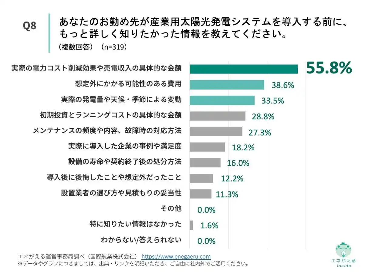「Q8. Q1で「オンサイトPPA(自社敷地内に設置し、発電した電力を購入する)」「オフサイトPPA(自社敷地外の発電所から電力を購入する)」「自己所有(自社で設備を購入・所有している)」と回答した方にお聞きします。あなたのお勤め先が産業用太陽光発電システムを導入する前に、もっと詳しく知りたかった情報を教えてください。(複数回答)」