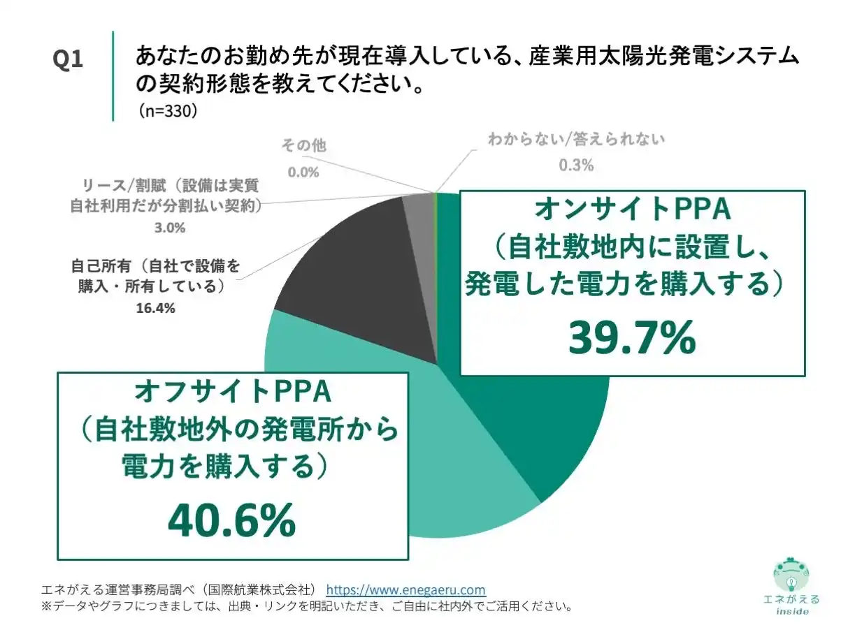 「Q1. あなたのお勤め先が現在導入している、産業用太陽光発電システムの契約形態を教えてください。」(n=330)と質問したところ、「オンサイトPPA(自社敷地内に設置し、発電した電力を購入する)」が39.7%、「オフサイトPPA(自社敷地外の発電所から電力を購入する)」が40.6%という回答になりました。 |