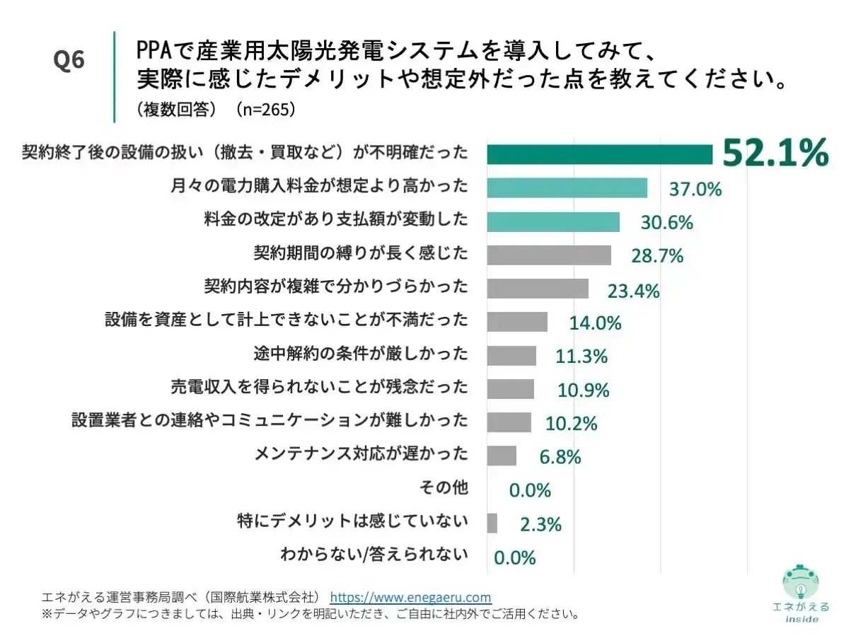「Q6. Q1で「オンサイトPPA(自社敷地内に設置し、発電した電力を購入する)」「オフサイトPPA(自社敷地外の発電所から電力を購入する)」と回答した方にお聞きします。PPAで産業用太陽光発電システムを導入してみて、実際に感じたデメリットや想定外だった点を教えてください。(複数回答)」(n=265)と質問したところ、「契約終了後の設備の扱い(撤去・買取など)が不明確だった」が52.1%、「月々の電力購入料金が想定より高かった」が37.0%という回答になりました。 |