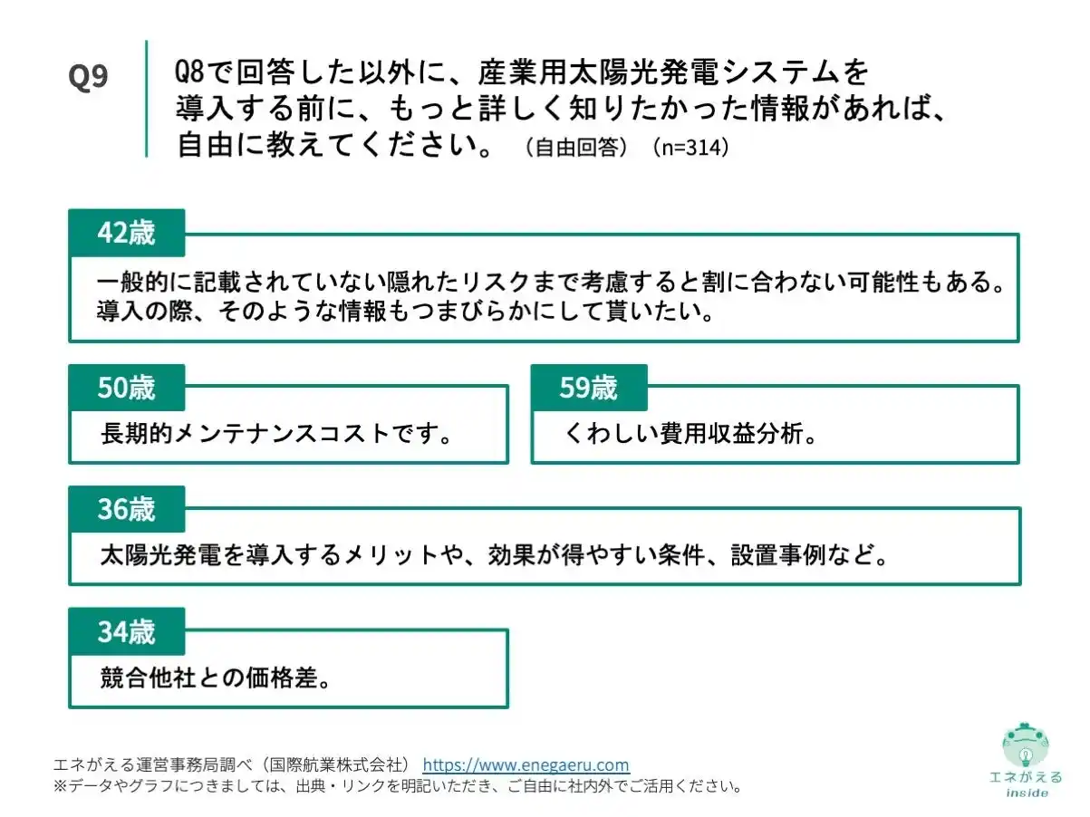 「Q9. Q8で「特に知りたい情報はなかった」「わからない/答えられない」以外を回答した方にお聞きします。Q8で回答した以外に、産業用太陽光発電システムを導入する前に、もっと詳しく知りたかった情報があれば、自由に教えてください。」