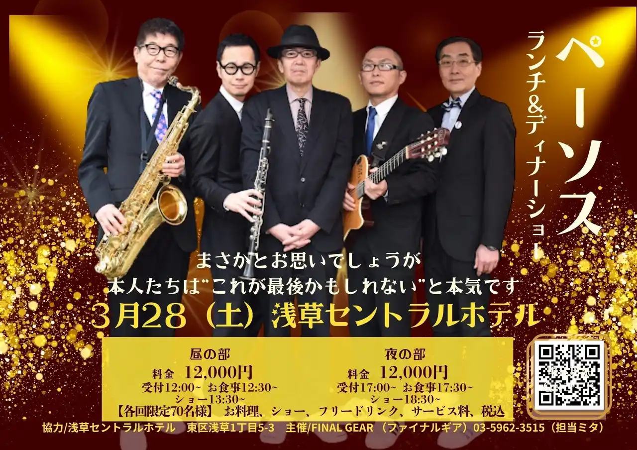 3月28日(土)、浅草セントラルホテルにて、平均年齢62歳のオヤジバンド「ペーソス」がディナーショーを開催することとなった。 |