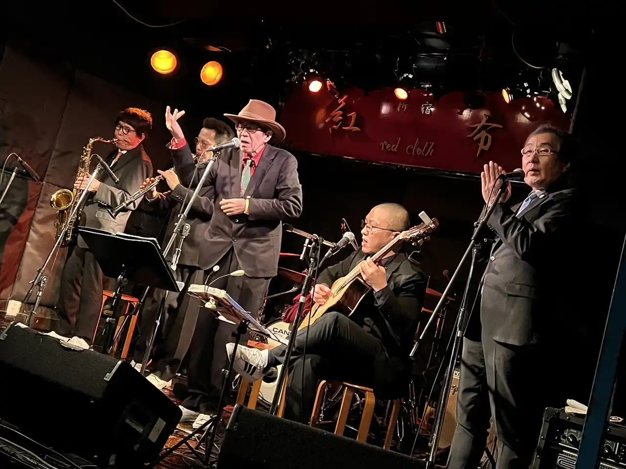 写真左から、サックス末井昭、クラリネット近藤哲平、ボーカル島本慶、ギター米内山尚人、専属司会スマイリー井原 |