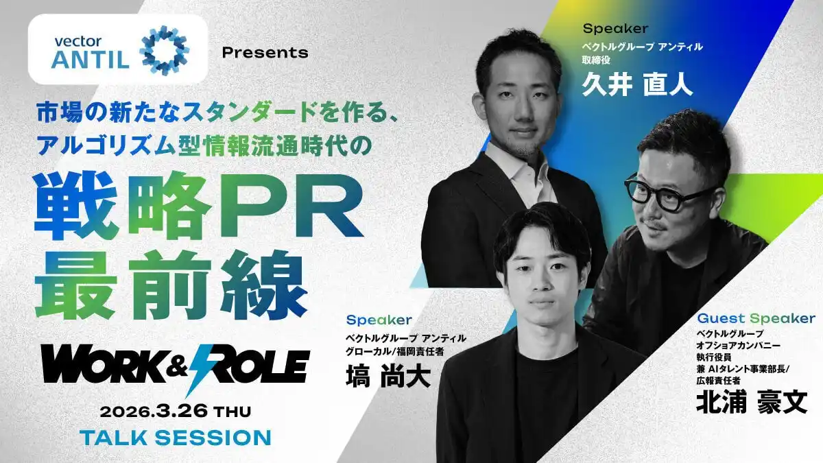 | 株式会社ベクトル(本社:東京都港区、代表取締役社長CEO:西江 肇司、東証プライム:6058、以下ベクトル)のグループ会社であり、AIを活用したSaaS事業を中心にTech領域を担う株式会社オフショアカンパニー(本社:東京都港区、代表取締役:野呂 健太、以下オフショアカンパニー)は、2026年3月26日(木)に開催されるイベント「WORK AND ROLE 2026」において、当社の執行役員・北浦豪文がベクトルグループ アンティル取締役の久井直人氏、同社グローカル・福岡責任者の塙尚大氏とともにトークセッションに登壇することをお知らせします。 | |||