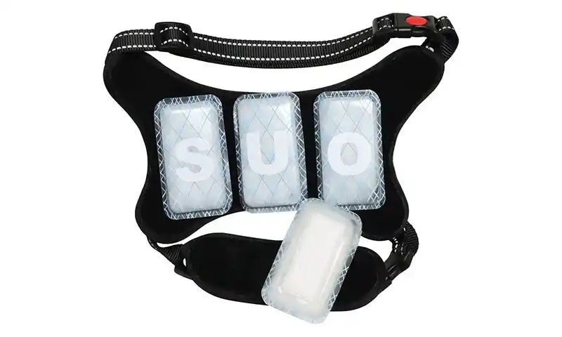 また、近年の猛暑により、地面に近い位置を歩くワンちゃんの暑さ対策も急務となっています。 そこで当社は、夜間の安全対策に加え、日本国内で加工を行い、当社の得意とする「PCM冷却パッド」を取り付け可能な仕様にすることで、夏場の暑さ対策にも対応できる多機能ハーネスを開発いたしました。 |