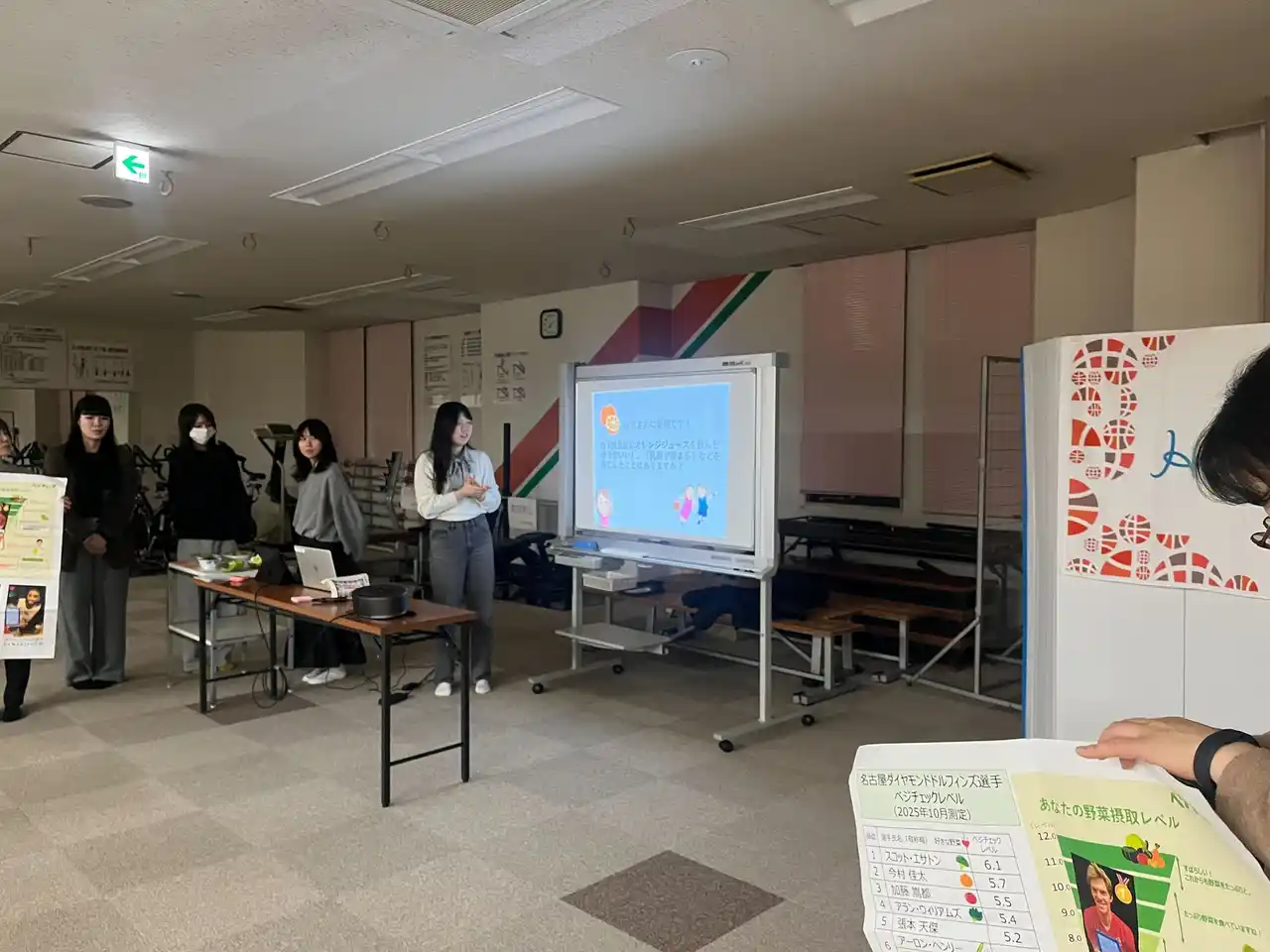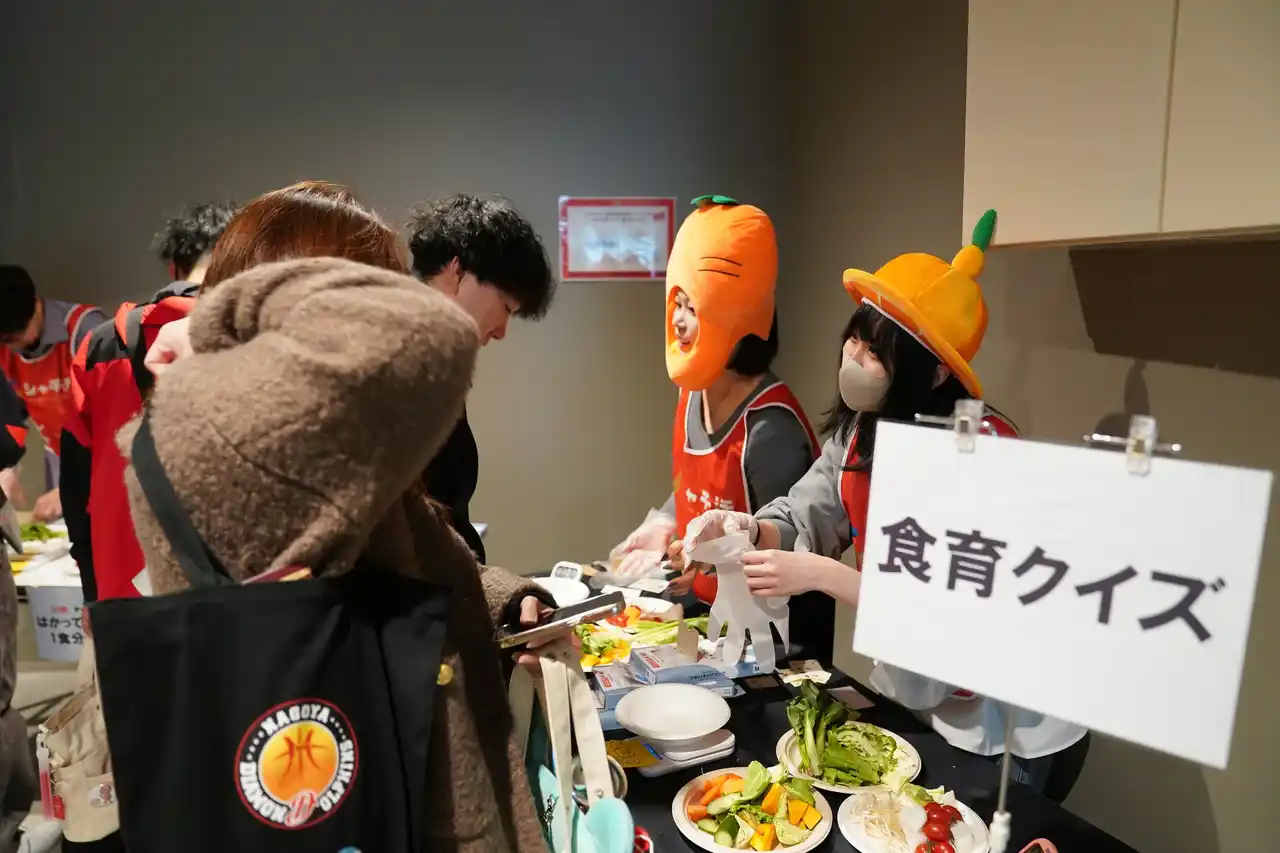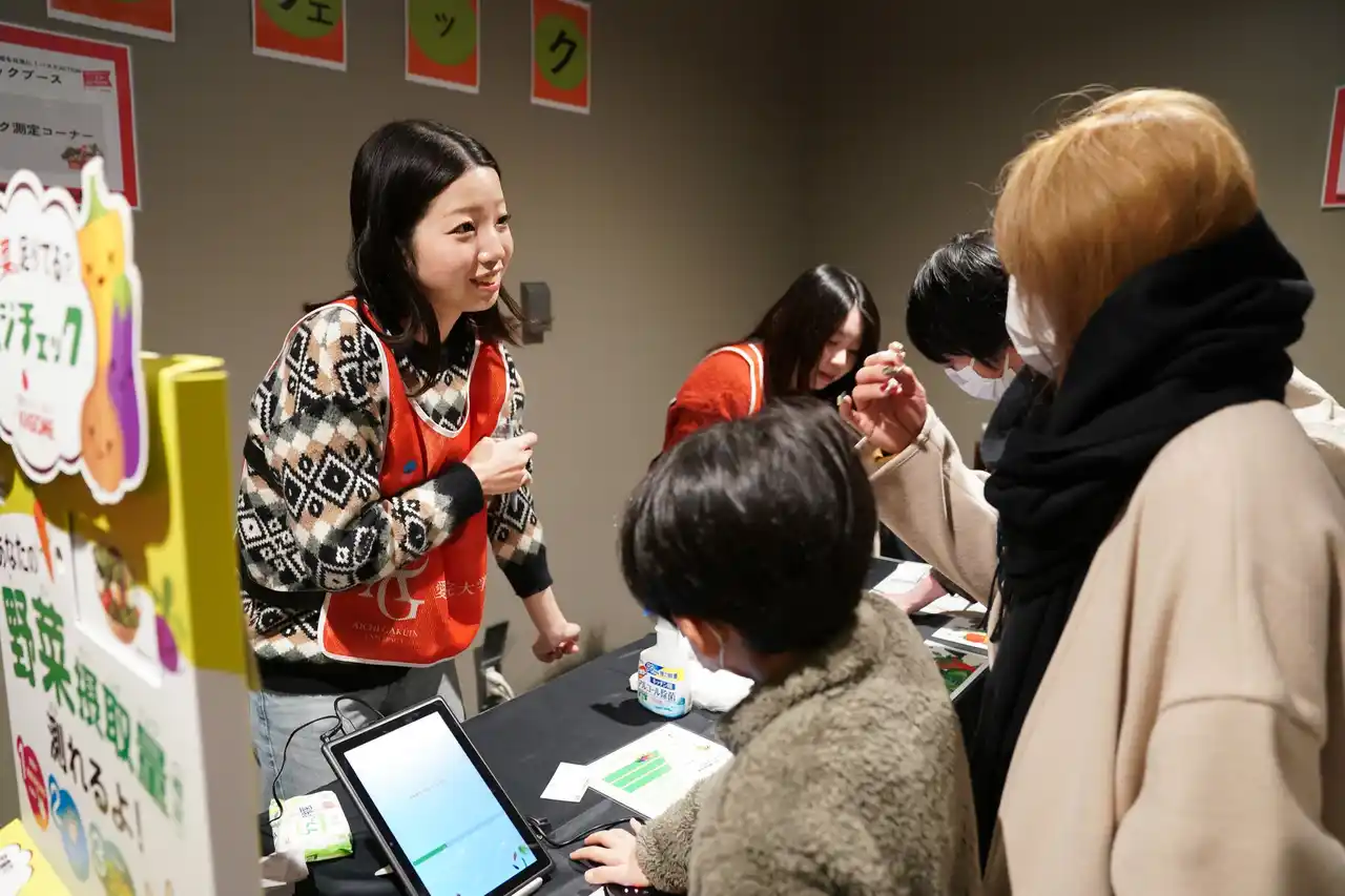 実施日:2025年12月14日(日) 会場:IGアリーナ 参加者数:500名 べジチェック測定後には、「1日に必要な野菜量の計測体験」、「野菜に関するクイズ」、「野菜を手軽に摂取できるレシピの紹介」という学生が考案したブースの中から、ファンの皆さまが興味を持ったブースに参加いただき、楽しみながら野菜摂取について学んでいただきました。 また、選手のべジチェック測定データをもとにした指標表も作成し、ファンの皆さまが自身の数値と比較しながら野菜摂取について考えるきっかけづくりの場を提供しました。 |