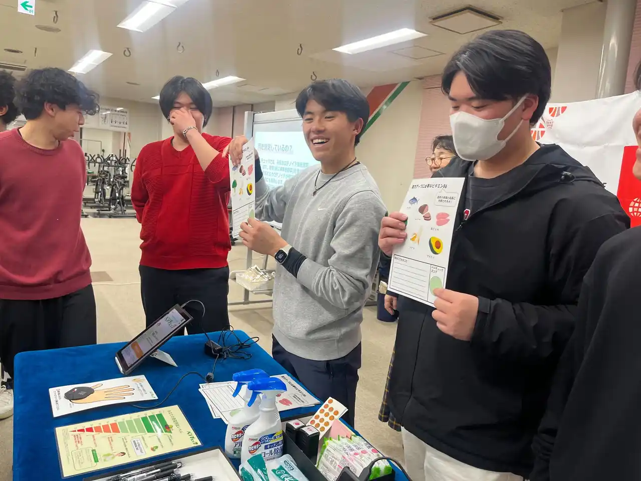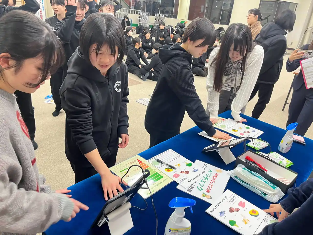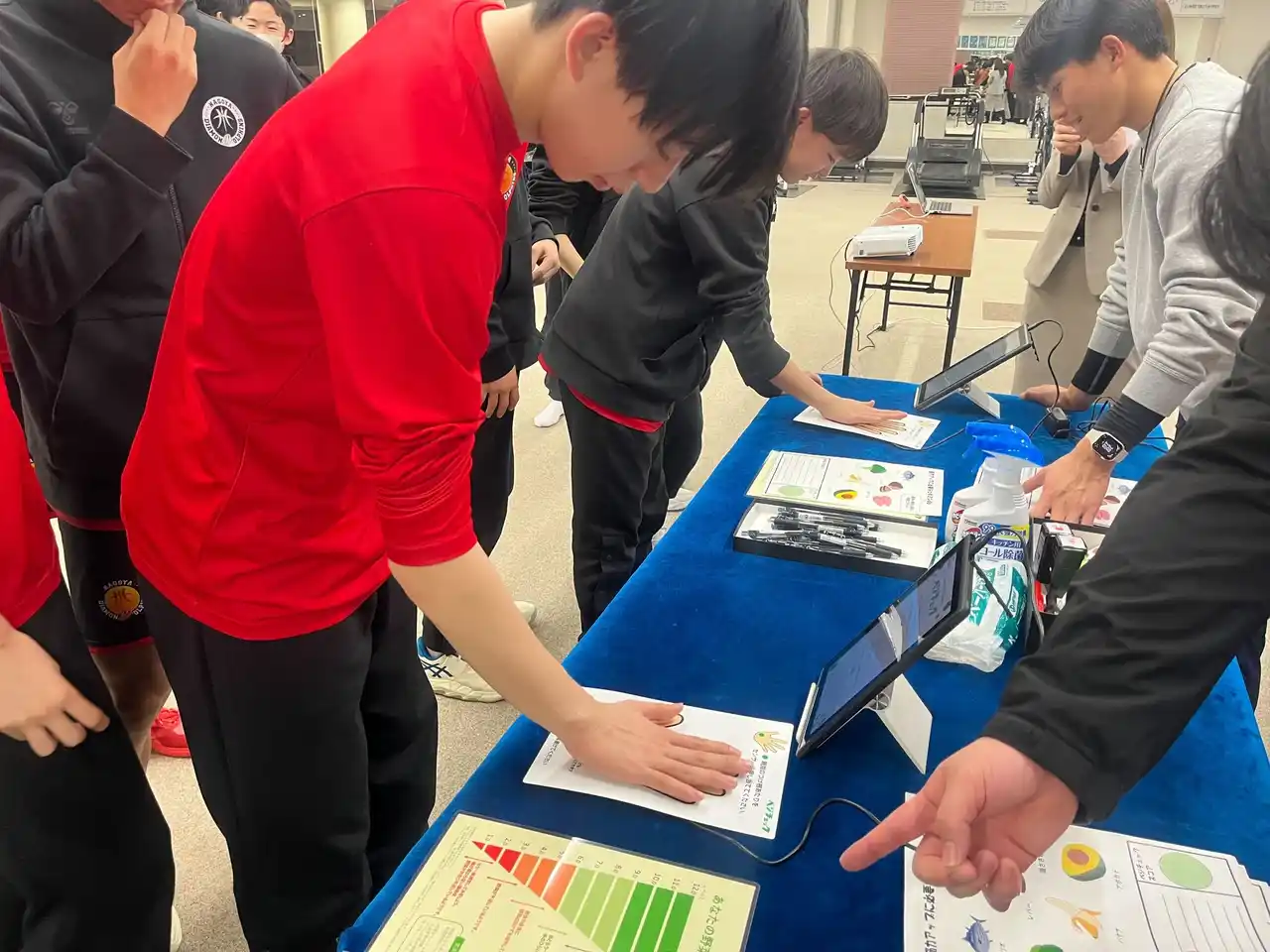 実施日:2025年12月14日(日) 会場:IGアリーナ 参加者数:500名 べジチェック測定後には、「1日に必要な野菜量の計測体験」、「野菜に関するクイズ」、「野菜を手軽に摂取できるレシピの紹介」という学生が考案したブースの中から、ファンの皆さまが興味を持ったブースに参加いただき、楽しみながら野菜摂取について学んでいただきました。 また、選手のべジチェック測定データをもとにした指標表も作成し、ファンの皆さまが自身の数値と比較しながら野菜摂取について考えるきっかけづくりの場を提供しました。 |