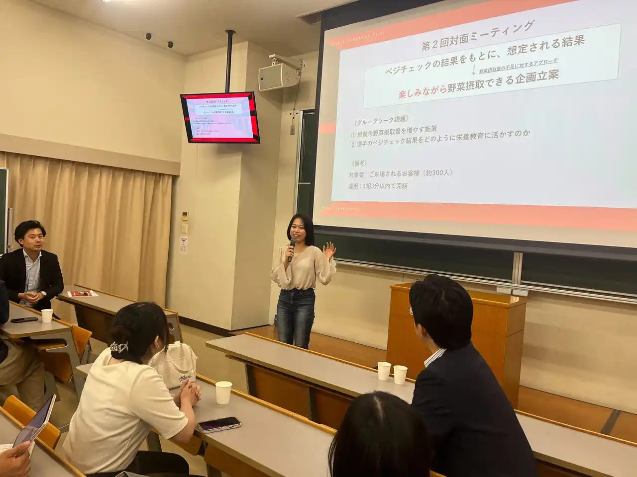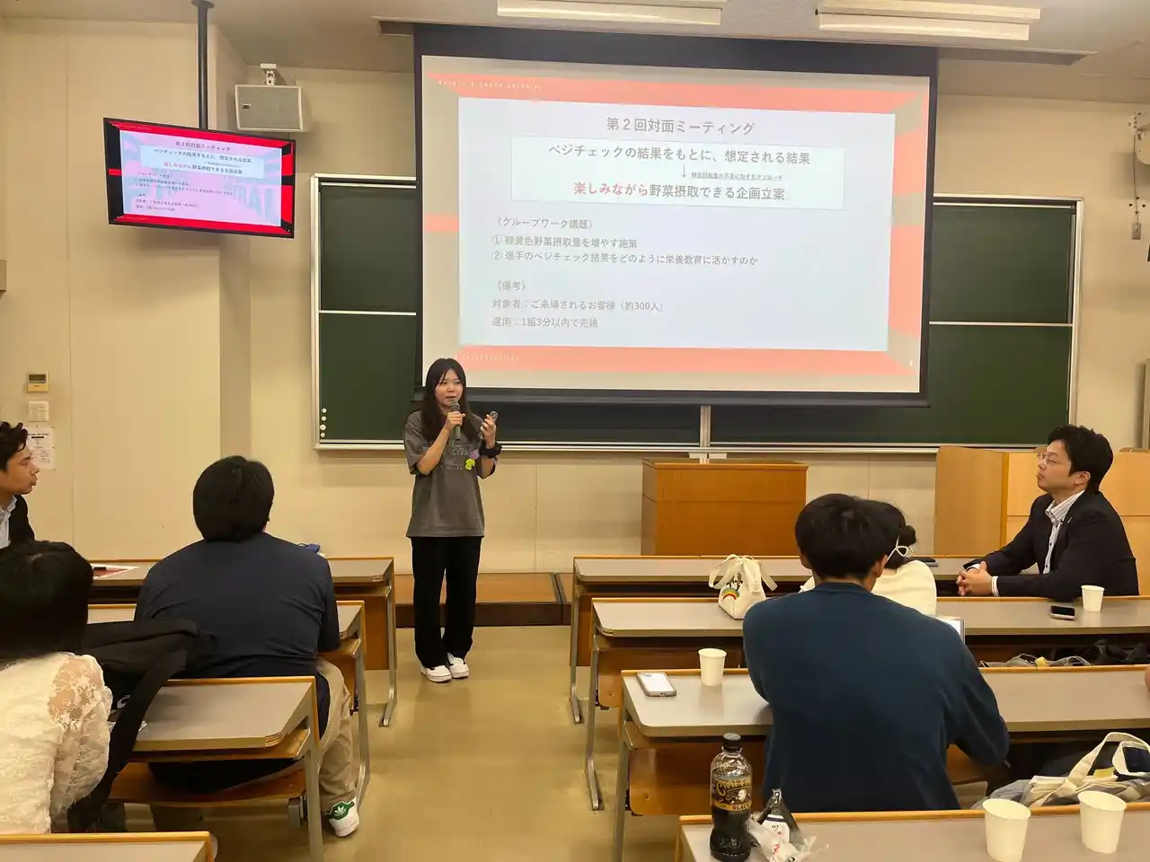 | 私自身がJr.チームでプレーしていた時に知りたかった内容を取り入れて発表しました。発表後には子どもたちが積極的に質問に来てくれたり、保護者の方とお話しする機会もあり、ベジチェックを通して野菜への関心を少しでも持っていただけたと感じました。また、実際にスポーツに取り組む子どもたちに伝えることで、これまで以上に広い視野で物事を見る大切さを学ぶ機会となりました。 | |||||||||
