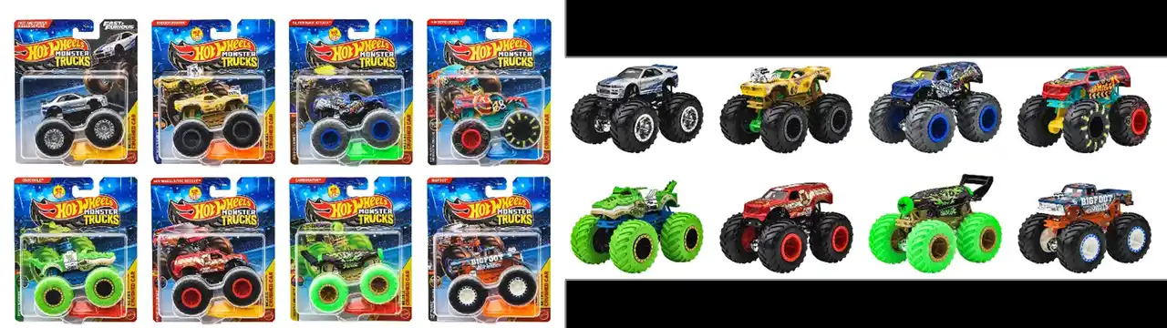 1/64スケールのモンスタートラックに、ワニをモチーフとした新金型モデル「クロコバイル」をはじめ、ドリンクボトルを模したユニークなボディが目を引く「カーボネーター」など、遊び心あふれるオリジナルカーが登場します。さらに、実車ファンからの人気も高い「ワイルド・スピード 日産 スカイライン」もラインアップされ、コレクションとしても楽しめる内容となっています。モンスタートラックでクラッシュできる車も1台付属し、すぐに迫力あるアクションを楽しめます。 |