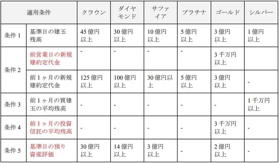 自動適用の条件に、日次判定条件、投資信託の平均残高および預り資産評価を追加します。 |
