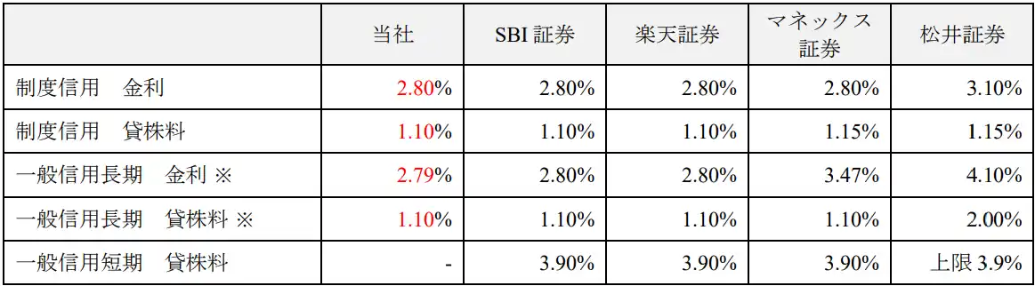 <信用取引における信用金利・貸株料他社比較(年率)> |