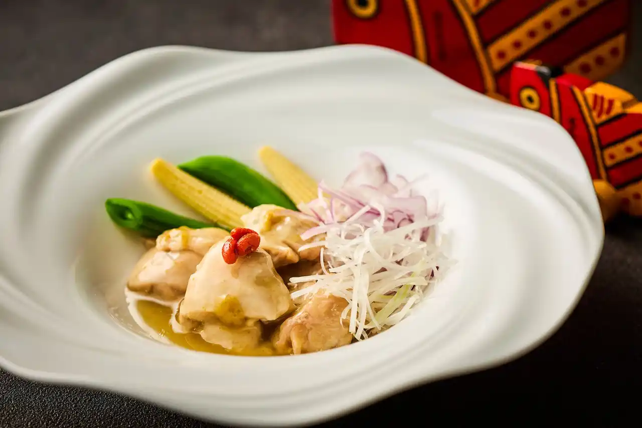 鹿児島県で開発された希少なブランド地鶏“さつま地鶏”は、肉本来のコクと深みのある味わいに、噛むほどに広がる旨みが特徴です。じっくりと蒸すことで、ふっくらしっとりした身を楽しめます。柚子胡椒のピリッとした辛味が調和したソースが絶妙です。 |