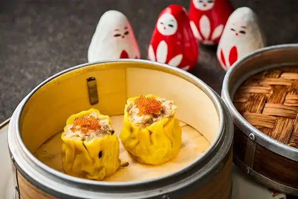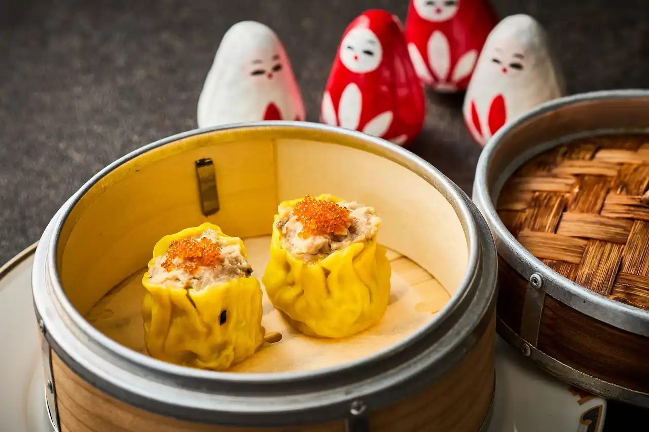 “鹿児島県産黒豚”に筍、干し椎茸、玉葱、くわいを入れて食感をプラスした焼売は、柔らかく肉の濃厚な旨みと甘みをお楽しみいただけます。見た目のアクセントと口の中でプチプチと弾ける食感をプラスするため、鹿児島県特産の“とびこ”を飾っています。 |