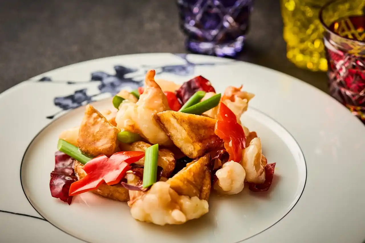 中国料理の定番である「海老とカシューナッツの炒め物」をアレンジし、カシューナッツの代わりに鹿児島県の郷土料理“さつま揚げ”と合わせました。さつま揚げの甘くコクのある味わいと弾力のある食感に、プリっとした海老との相性抜群の一品です。四川唐辛子がコクを一層引き立て、食欲をそそる豊かな風味に仕上げました。 |