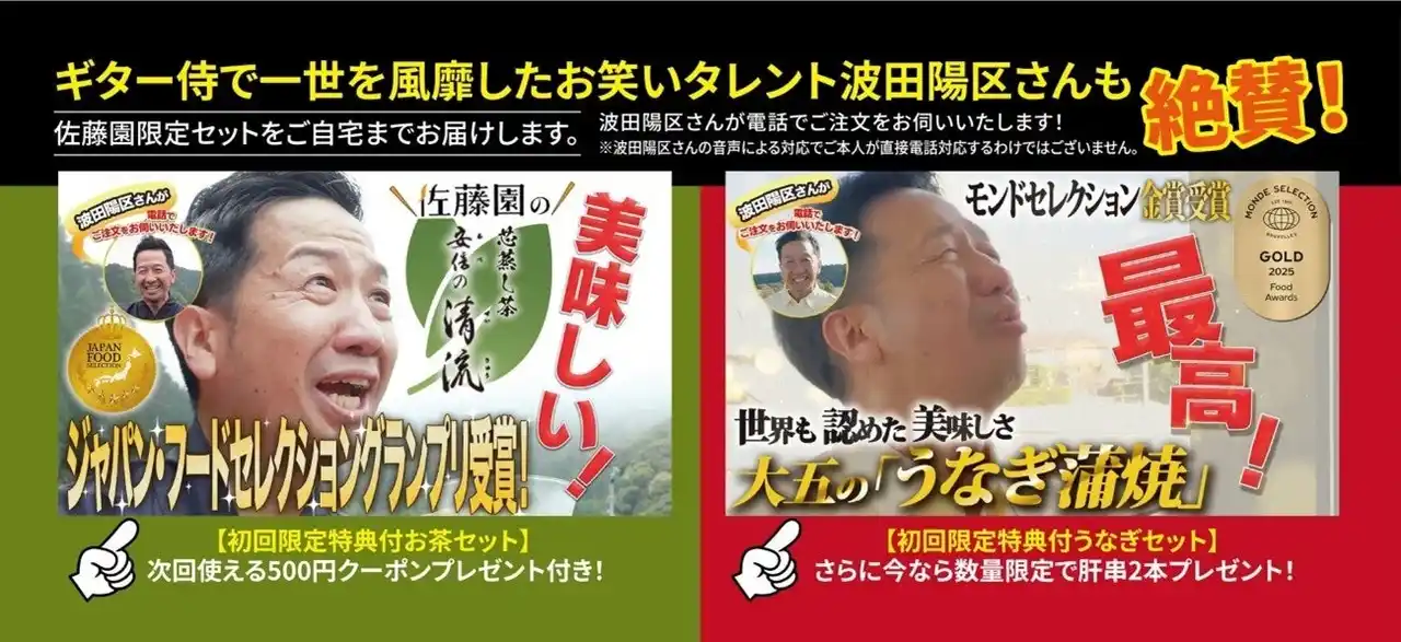 本企画では、ギター侍で一世を風靡したお笑いタレントの波田陽区さんが電話で注文をお伺いします。 |