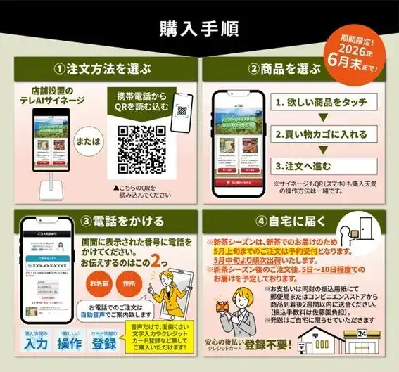 テレ株式会社(本社:東京都渋谷区、代表取締役:平野晃弘)は、株式会社佐藤園(本社:静岡県静岡市、代表取締役:瓦谷健)と共同で、AI×電話×デジタル端末を組み合わせた注文システム「テレAIカート」を活用した、文字入力やインターネット操作を必要としない新しいECサービスの実証実験を開始します。 |