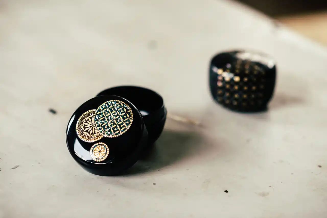 1910年創業の武蔵川工房は、その伝統技法「青貝塗」を代々継承する工房で、四代目・武蔵川剛嗣氏は若き伝統工芸士として活躍。伝統文様を現代的にアレンジし、螺鈿とカジュアルなプロダクトを組み合わせるなど、新しいものづくりにも挑戦しています。 |