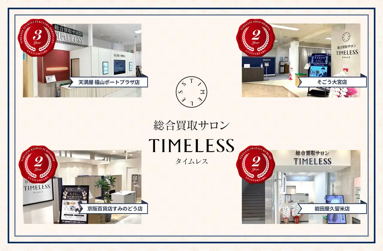 総合リユースサービス(オークション・総合買取サロン・古物商プラットフォーム)を展開する、株式会社タイムレス(本社:東京都港区、代表取締役社長:馬場 浩太)は、2026年4月で周年を迎える、総合買取サロンタイムレス「そごう大宮店」「京阪百貨店 すみのどう店」「岩田屋久留米店」「天満屋 福山ポートプラザ店」にて2026年4月1日(水)~4月30日(木)(※1)の期間「周年キャンペーン」を実施いたします。 |