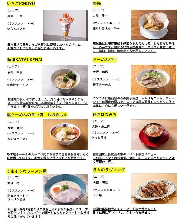 「豊麺(大阪・豊中)」鰹だし醤油らーめん・「うまそうなラーメン屋(大阪・梅田)」脳好クリーミーラーメン醤油、イベント初出店の「麺逢KATAJIKENAI(京都・西院)」貝出汁ラーメン・「らーめん賛平(大阪・鶴橋)」賛平らーめんなど、バリエーション豊かなラーメンが一堂に会します。 |