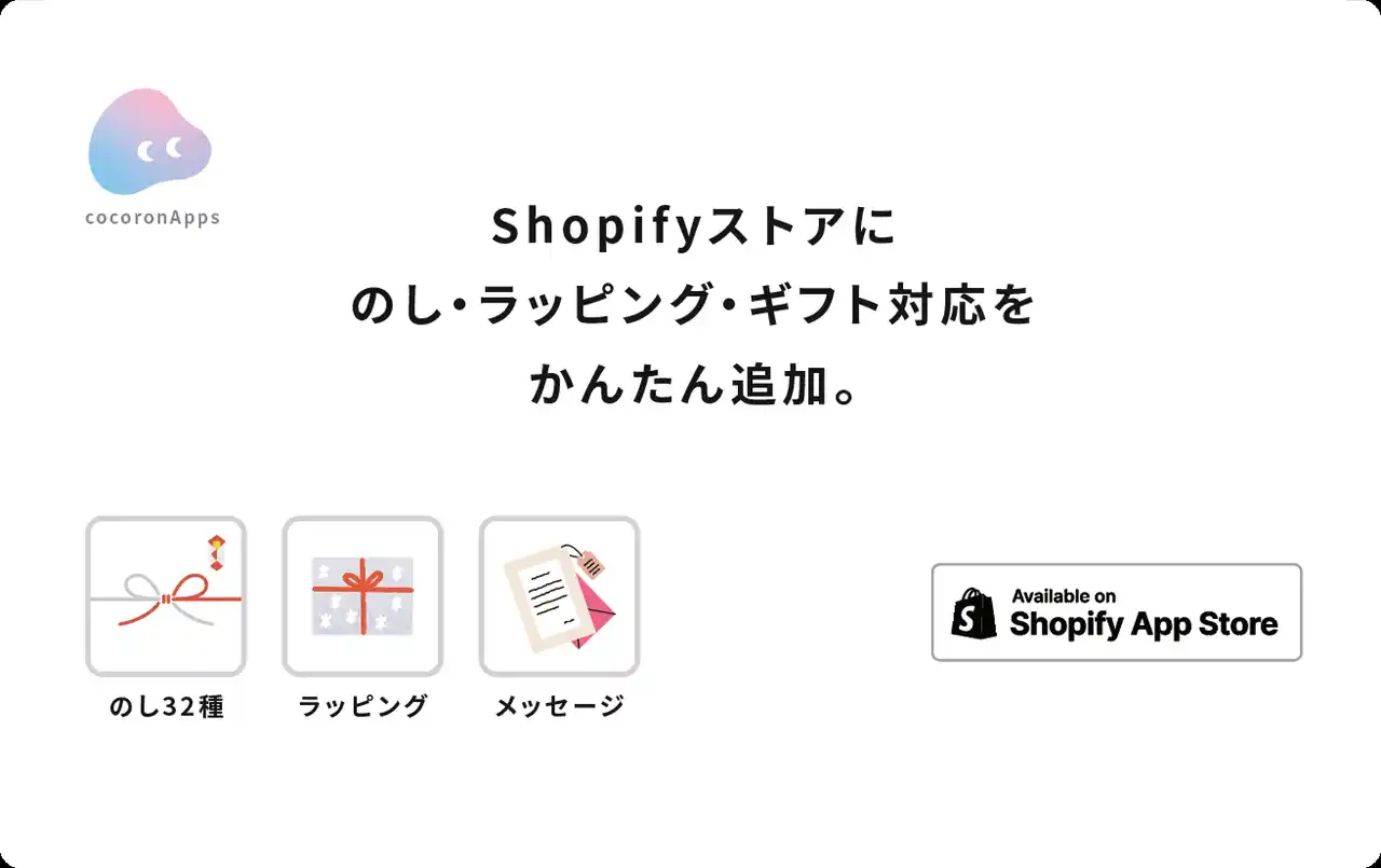 cocoronApps(今村紅)によるShopify向けギフト統合アプリ。「SAKUシンプルのし」「SAKUシンプルギフトオプション」の機能を1アプリで完結させたい事業者向けの選択肢として同日ローンチします。 |
