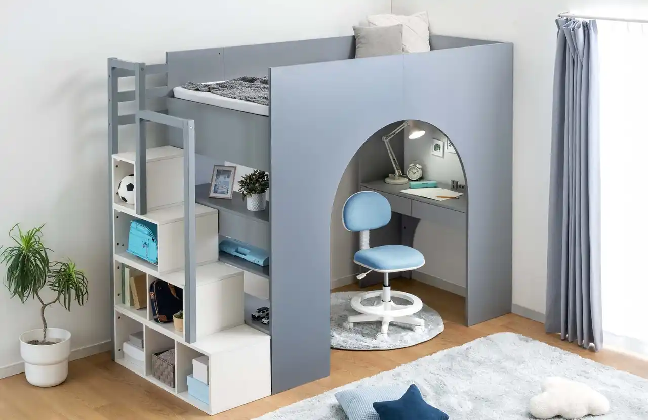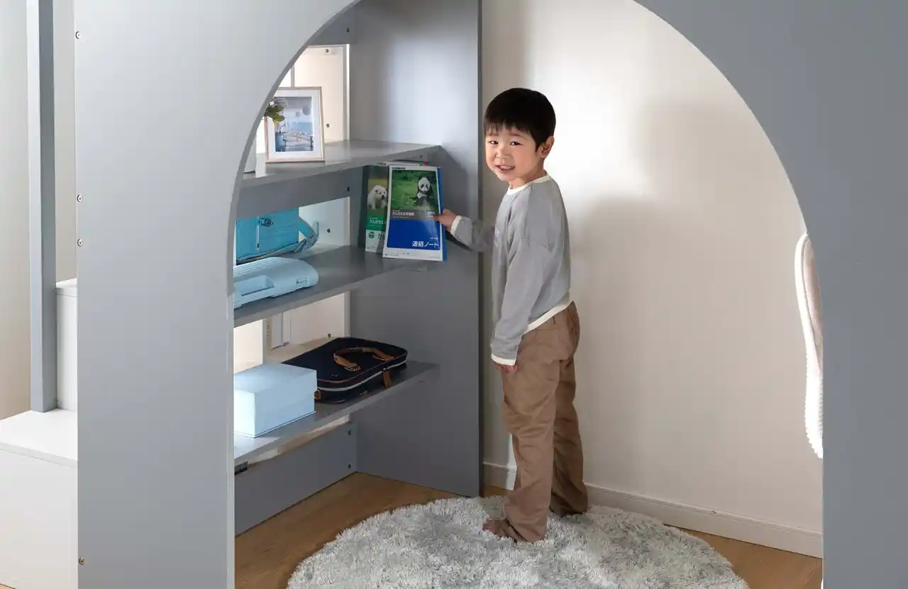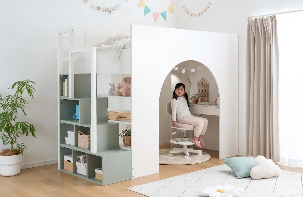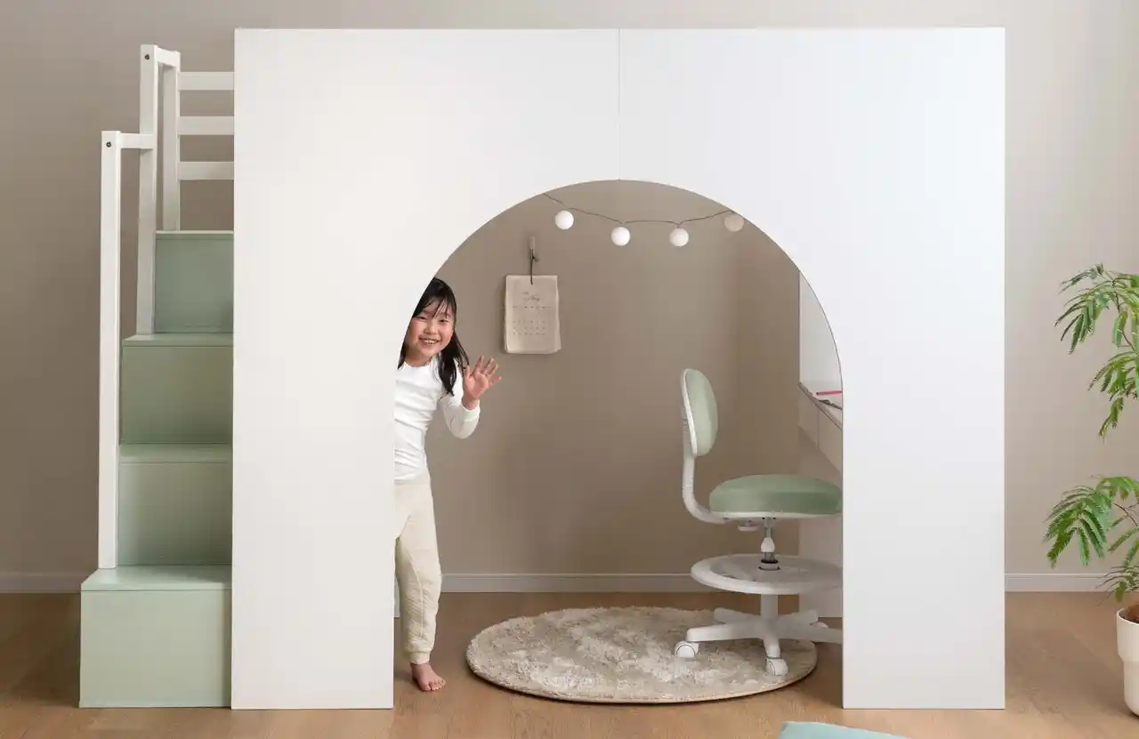 今回発売した「HIDE-A ARCH(ハイドエー アーチ)」は、側面のアーチデザインからロフト下へと出入りできる設計で、その内部にはまるで秘密基地のような空間が広がります。入り口をくぐるたびに感じる高揚感と、自分だけの場所として過ごせる半個室の空間が、遊び心と安心感を同時に提供します。 |