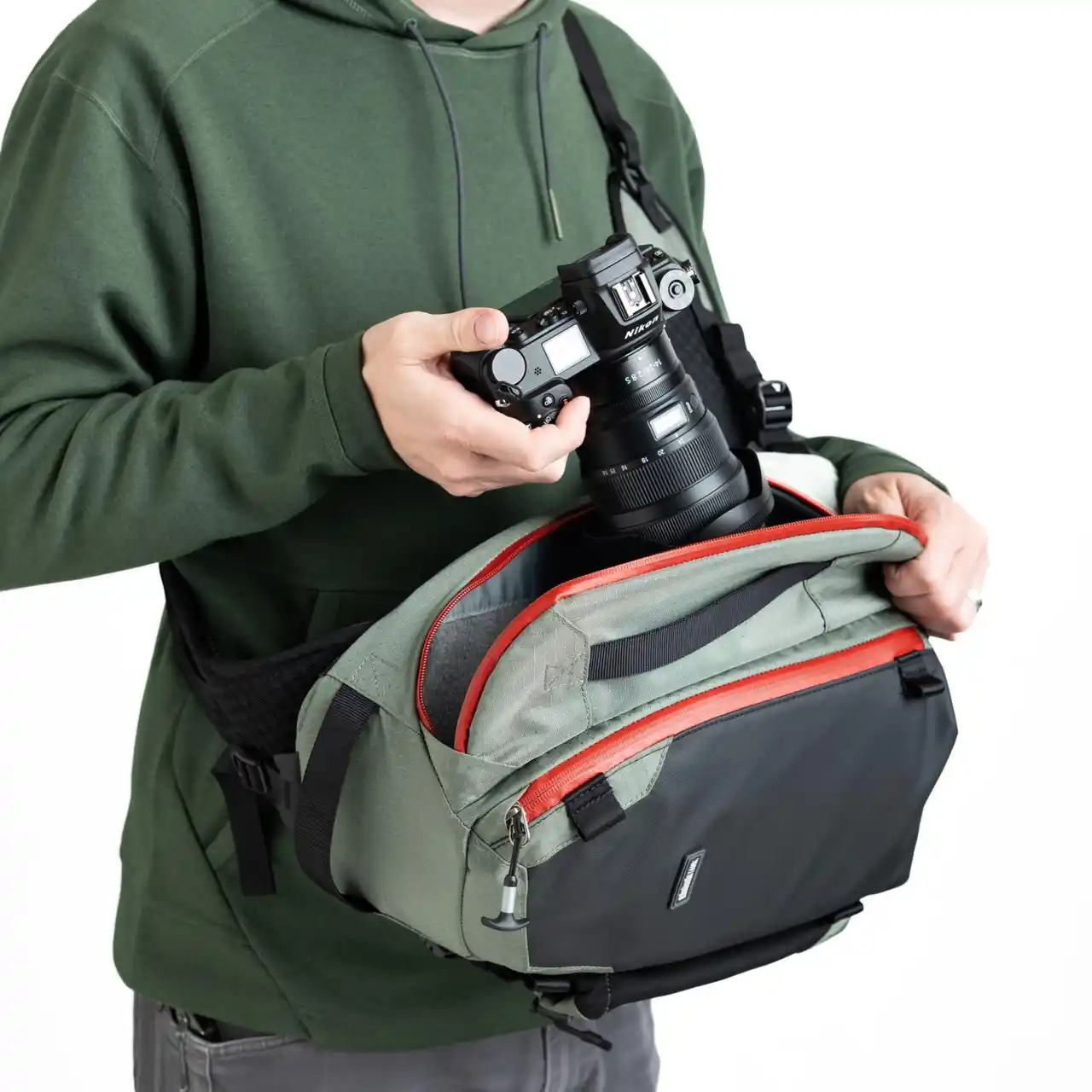 バッグを背中から前面へ素早く回転させるだけで、サイドパネルから機材を取り出せる「スウィングアクセス構造」を採用。バッグを地面に下ろす手間を省き、決定的なシャッターチャンスを逃しません。 |