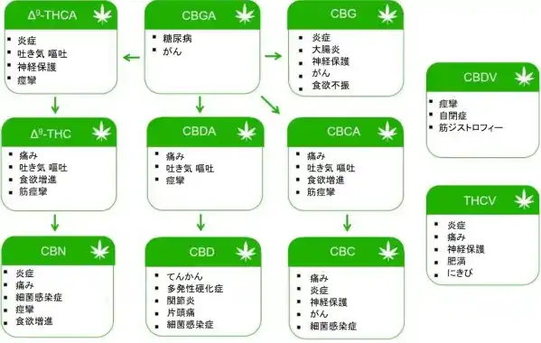カンナビジオール。144種類ある大麻草の独自成分カンナビノイドのうち、向精神作用のない成分で、てんかんの他に、アルツハイマー病、パーキンソン病、多発性硬化症、神経性疼痛、統合失調症、社会不安、抑うつ、抗がん、吐き気抑制、炎症性疾患、関節リウマチ、感染症、クローン病、心血管疾患、糖尿病合併症などの治療効果を有する可能性があると報告されている。2018年6月に行われたWHO/ECDD(依存性薬物専門家委員会)の批判的審査では、純粋なCBDは国際薬物規制の対象外であると勧告された。