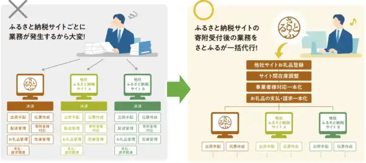 「さとふる」を含む複数のふるさと納税サイトの管理・運営を株式会社さとふるに一括して委託できるサービスです。運営業務を一元化することで、自治体や事業者の負担・経費軽減を実現しています。 |
